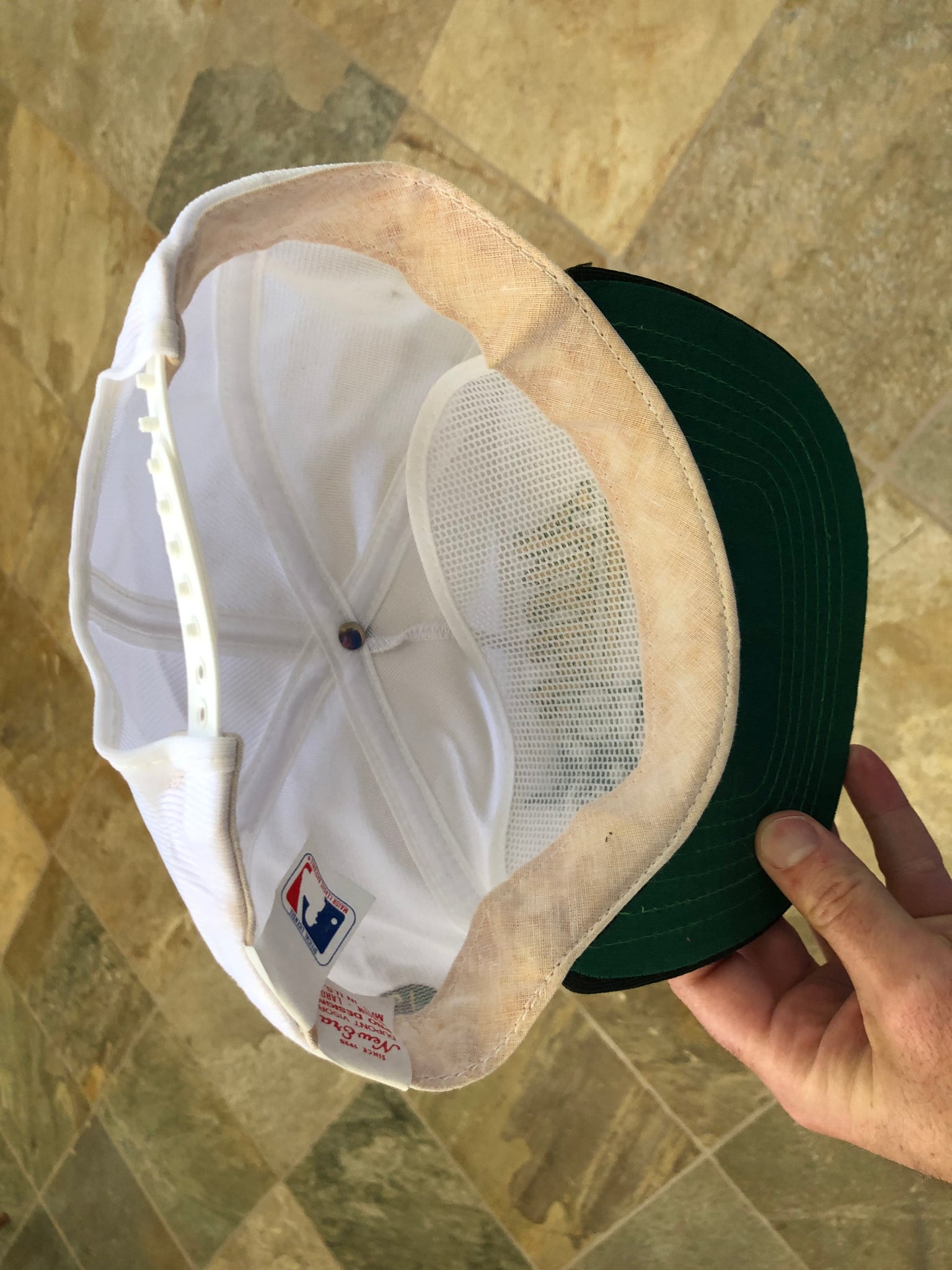 Vintage 1990 Oakland Athletics A’s AL Champions New Era Snapback Baseball Hat. Stadium planters peanuts giveaway. Some wear on band. Discolored from age, no sweat or wear. See photos
