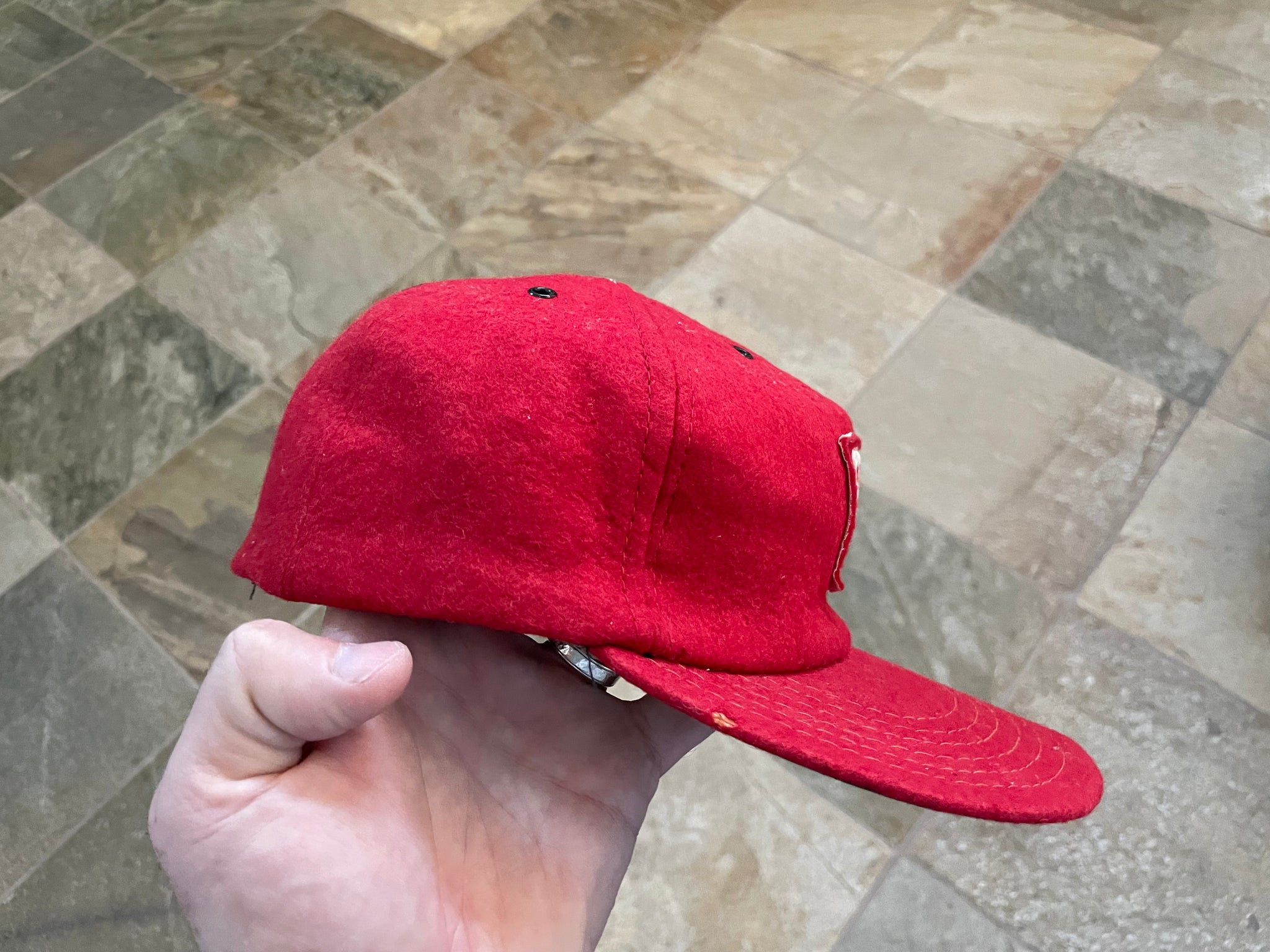 Vintage 1970s Philadelphia Phillies Stadium souvenir stand Fitted Baseball Hat. These were sold at Veterans stadium in the 70s. Leather band with back stretch fit. Wear on band. Some holes from age on dome. See photos for condition