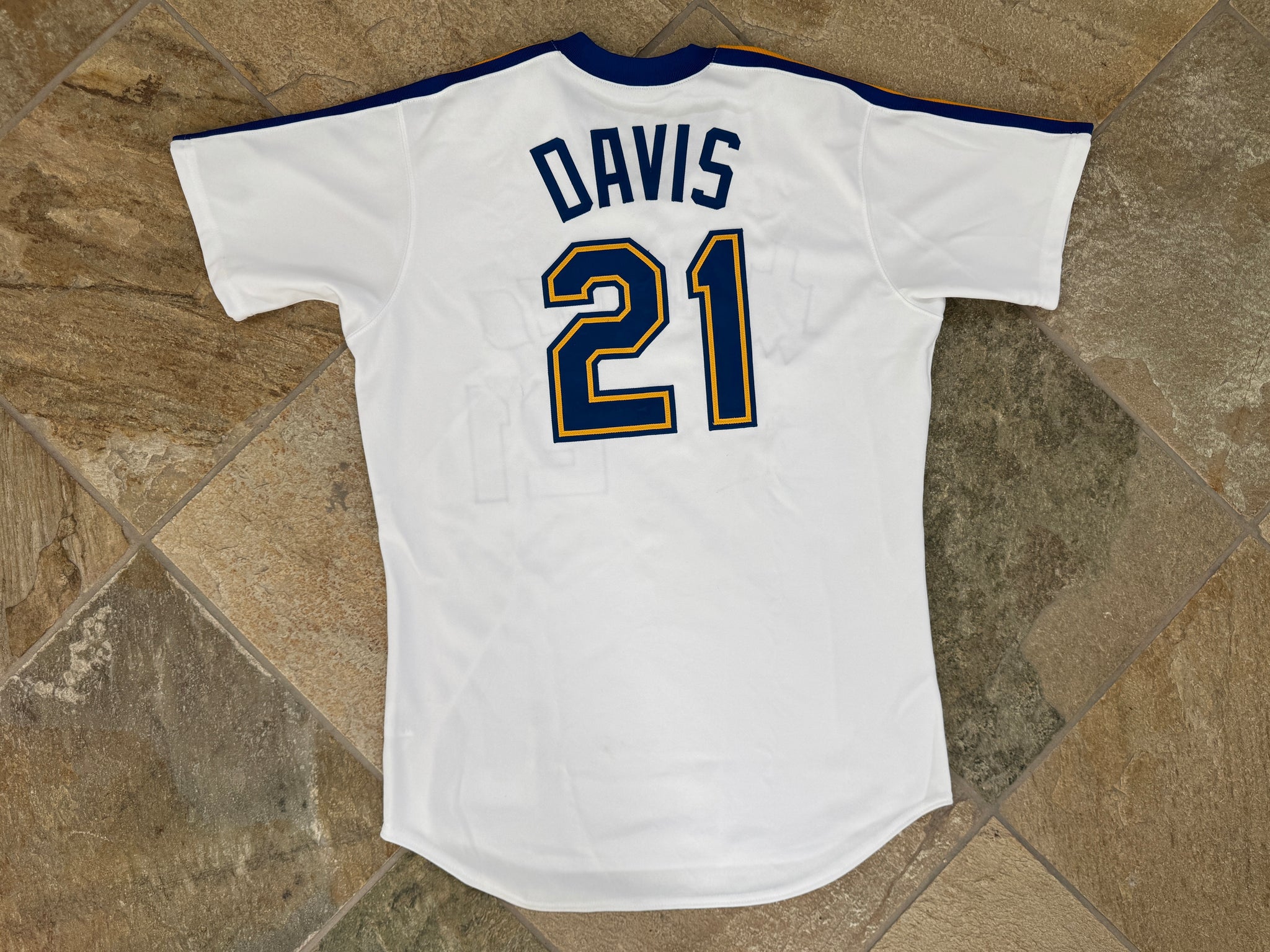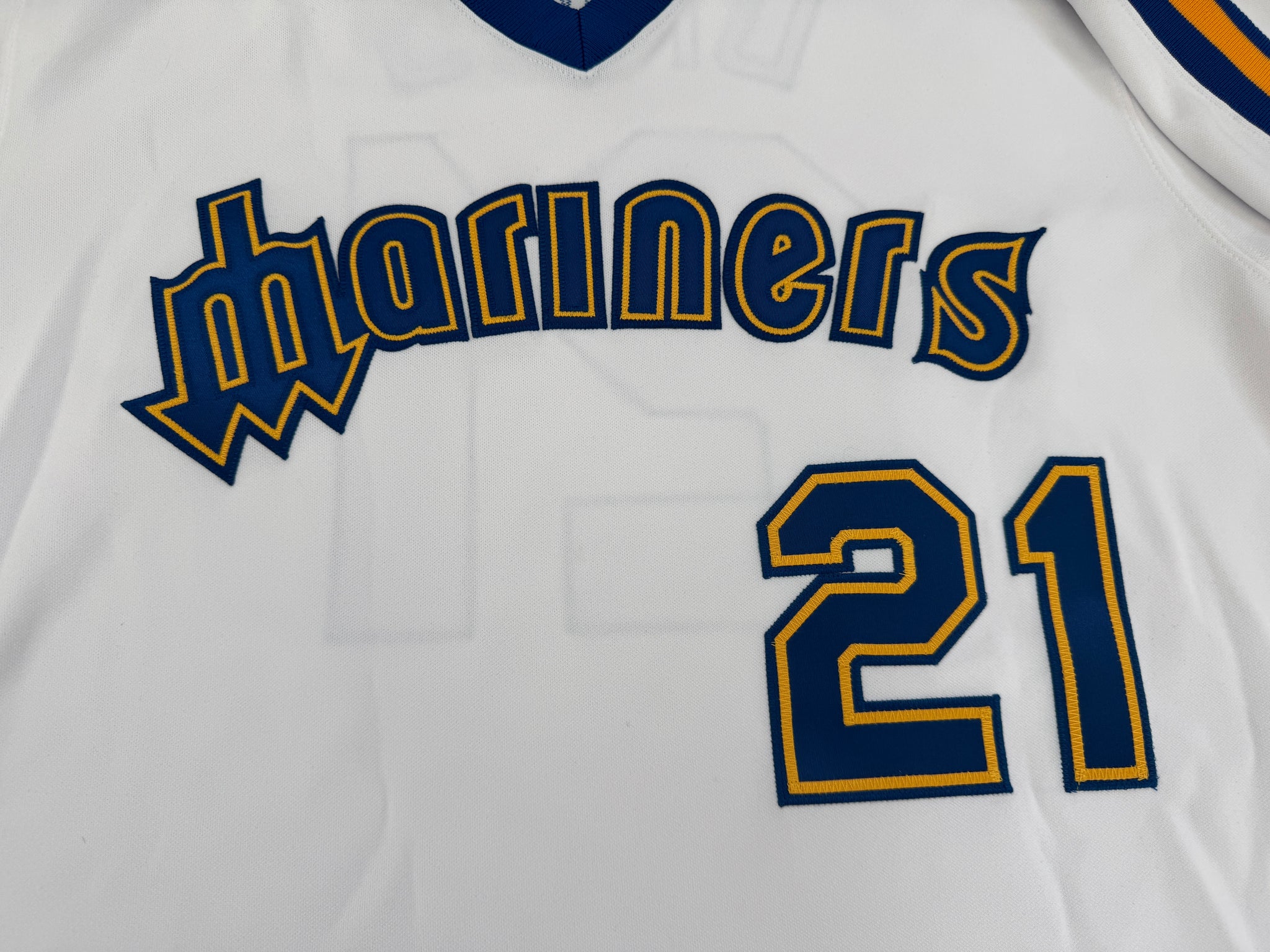 Seattle Mariners Alvin Davis #21 Team Issued possible ceremony ceremonial first pitch game used and worn Majestic Authentic collection Baseball Jersey, Size 44, Large. 80s Throwback style. From my research through team personnel, I believe this was a backup on filed jersey or one that he originally tried on and the team ended up making him another one- possible sizing issue. Sewn and stitched logos and nameplate. See photos for measurements