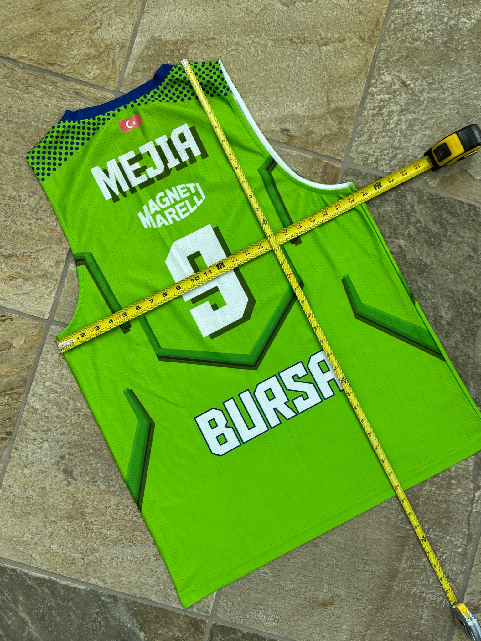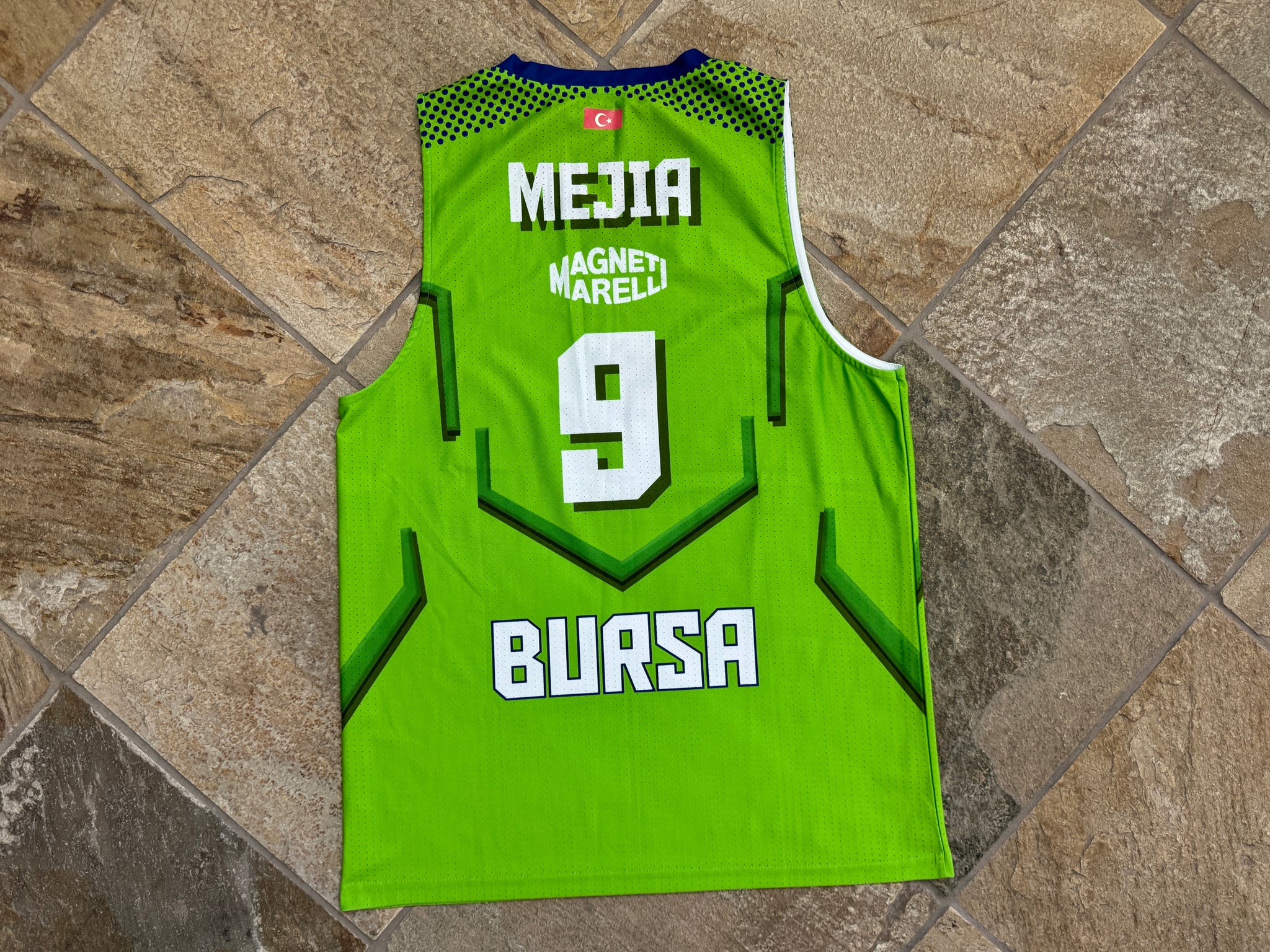 Tofas S.K. Turkey Turkish Bursa Super Liga Sammy Mejia team issued Game Worn used Basketball Jersey. Green with Fiat logo. Size Large. See photos for measurements