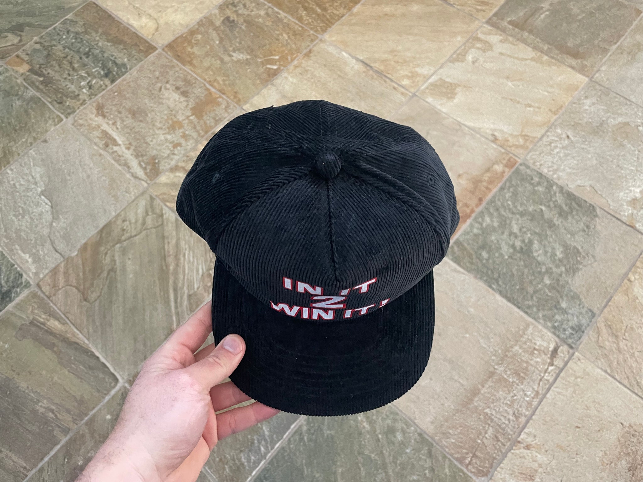Vintage 80s NCAA Tournament Final Four In It To Win It Snapback black corduroy College basketball Hat. Big logo block script spellout. Great condition overall. Yupoong snap. See photos