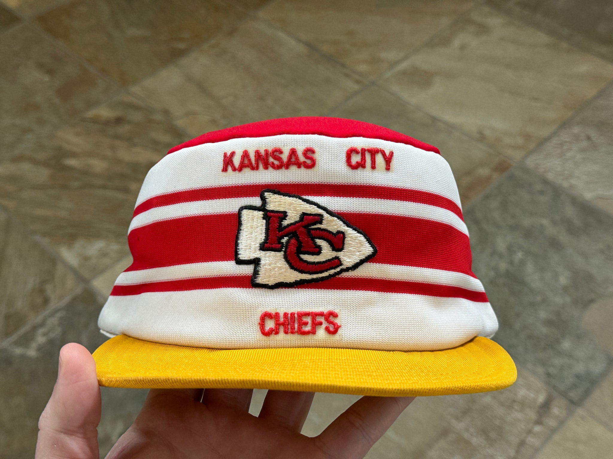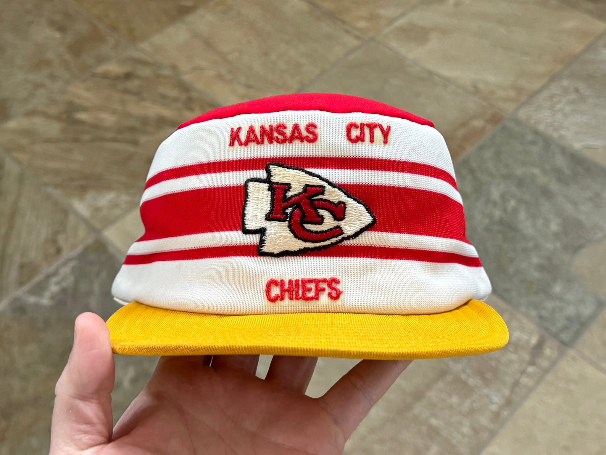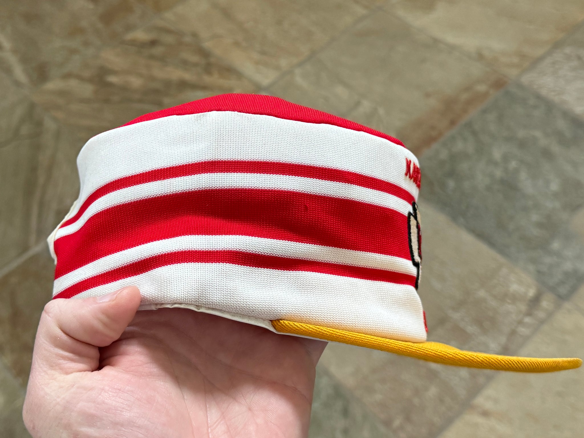 Vintage 80s Kansas City KC Chiefs AJD Pill Box Snapback Football Hat. Inner lining washed and shaped. Small, faint storage stain on top. Never worn. See photos