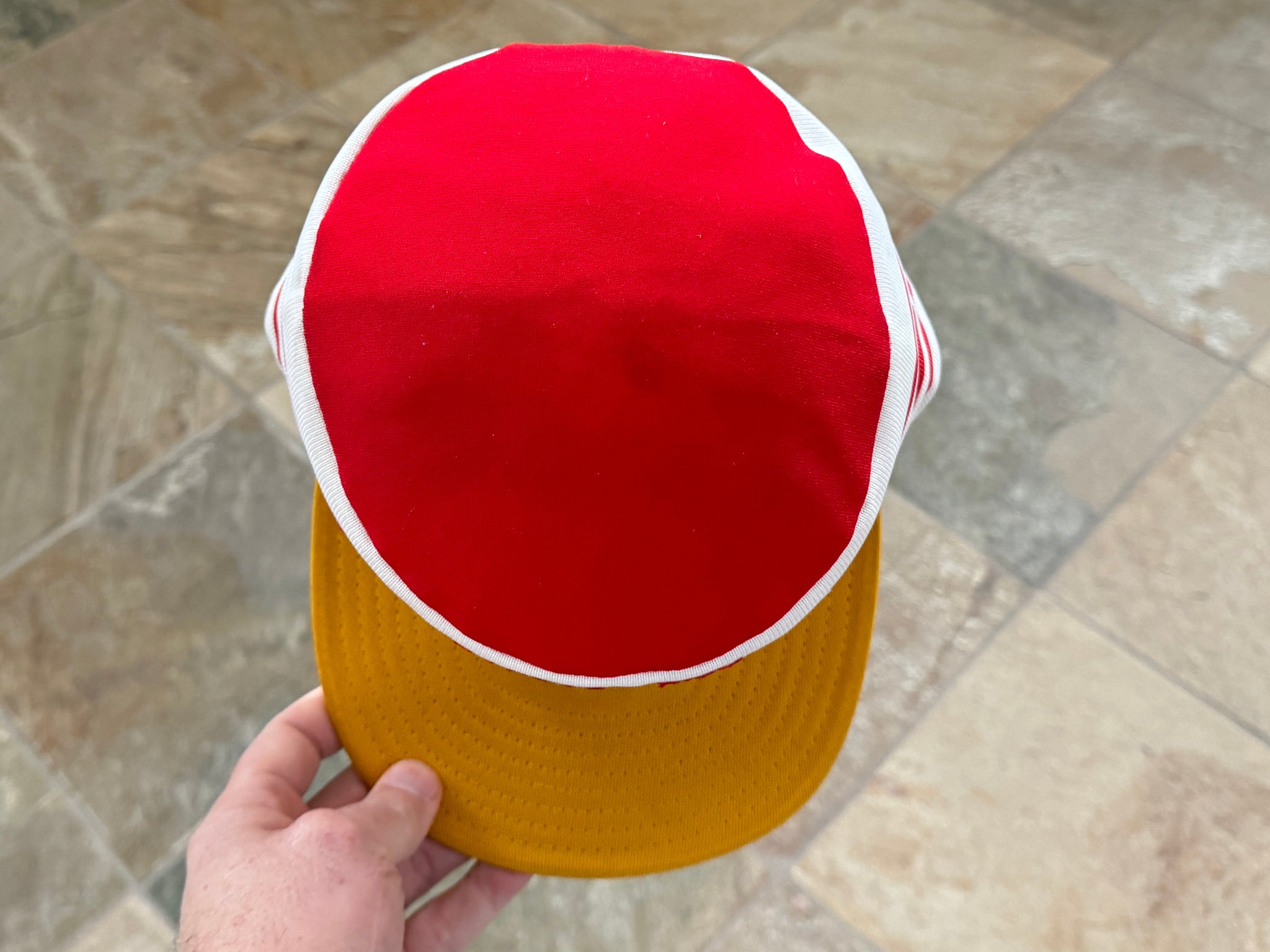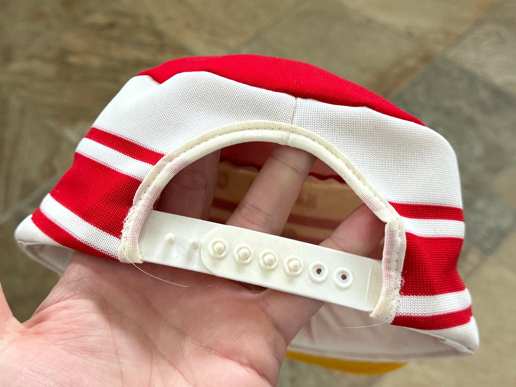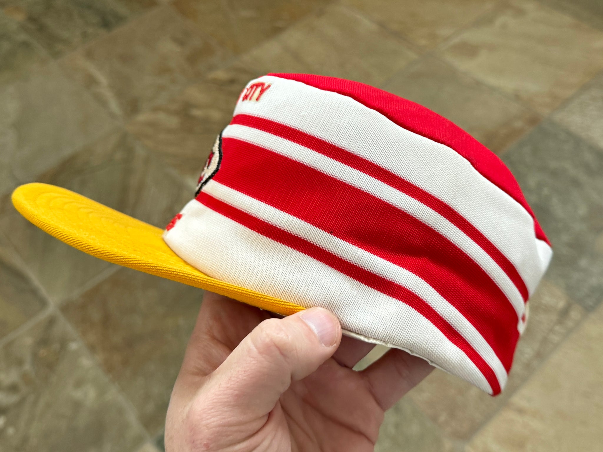 Vintage 80s Kansas City KC Chiefs AJD Pill Box Snapback Football Hat. Inner lining washed and shaped. Small, faint storage stain on top. Never worn. See photos