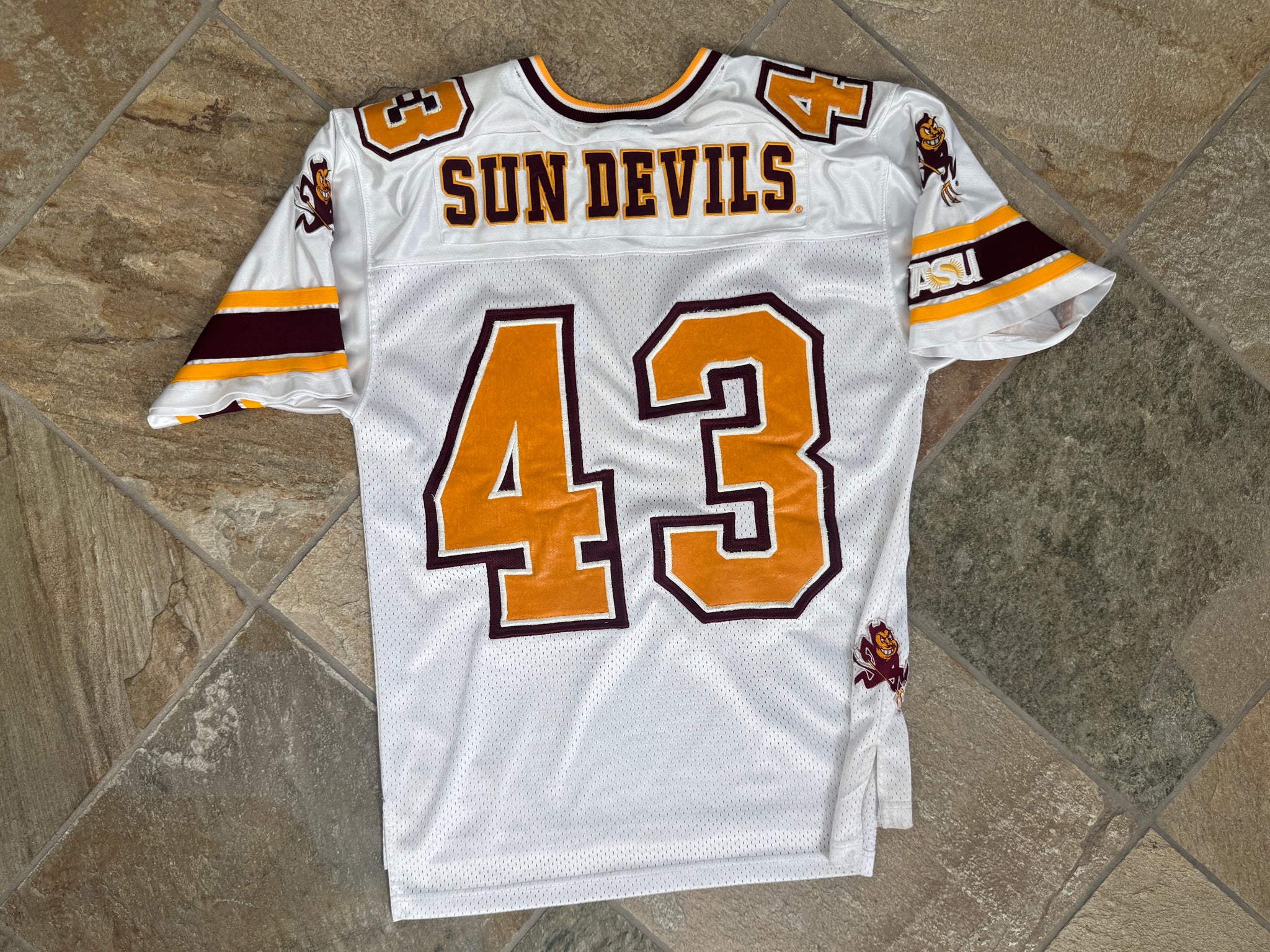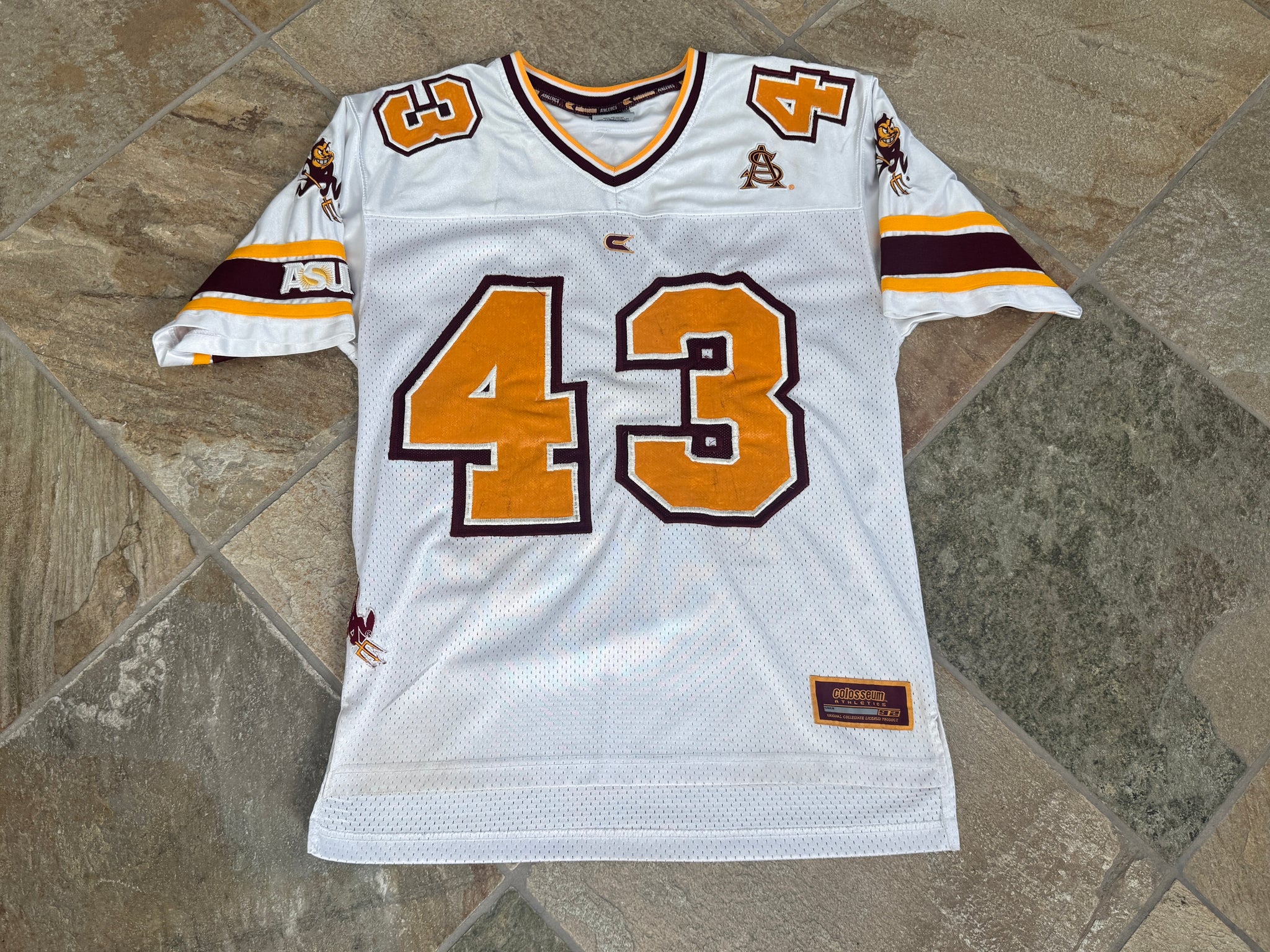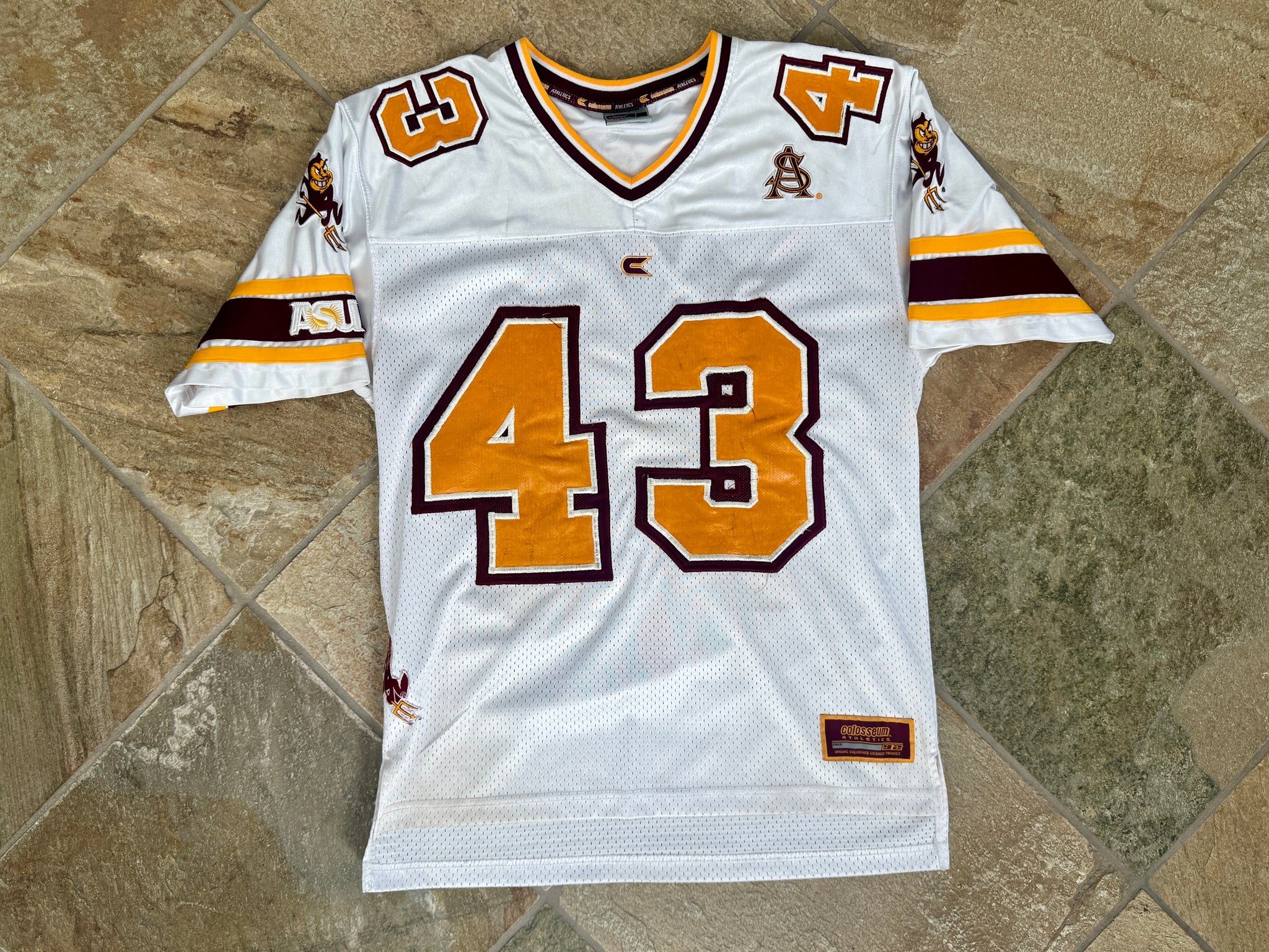 Vintage Arizona State Sun ASU Devils Colosseum College Football Jersey, Size Medium. Heavy authentic style with sewn and stitched patches and numbers. Some customization with nameplate and devil patches. Minor wear in places. Good, used condition overall. See photos for measurements