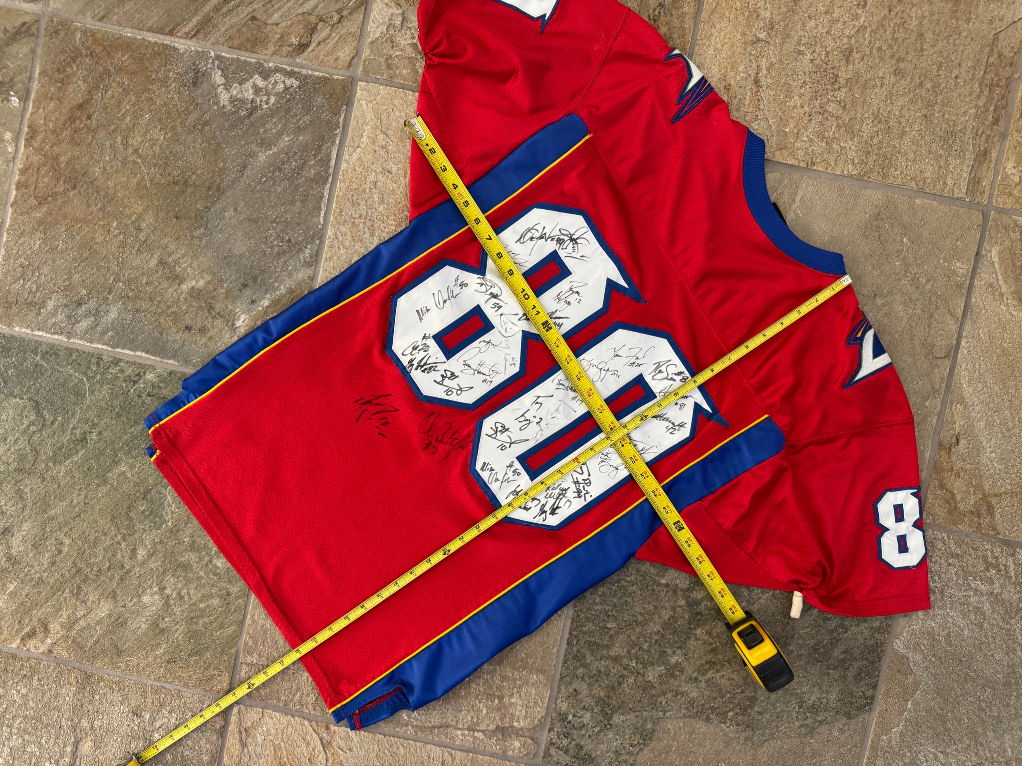 Vintage early 2000s Los Angeles LA Avengers team issued Game used Worn Wilson arena league Football Jersey, Size 46. #80. Nameplate has been removed. Sleeves are rubber banded from use. Jersey has multiple team signatures autographs on back, mainly on numbers. No COA. See photos for measurements
