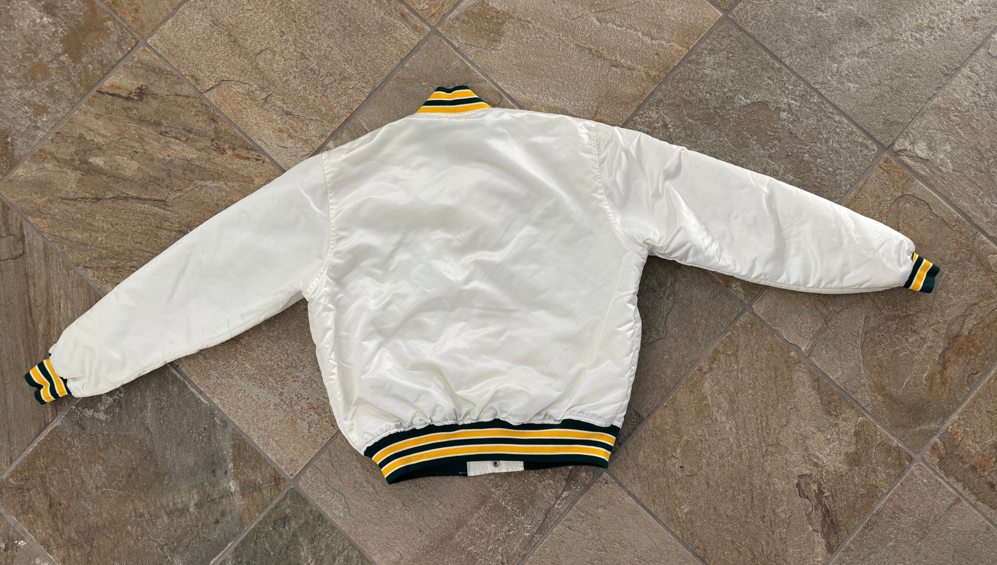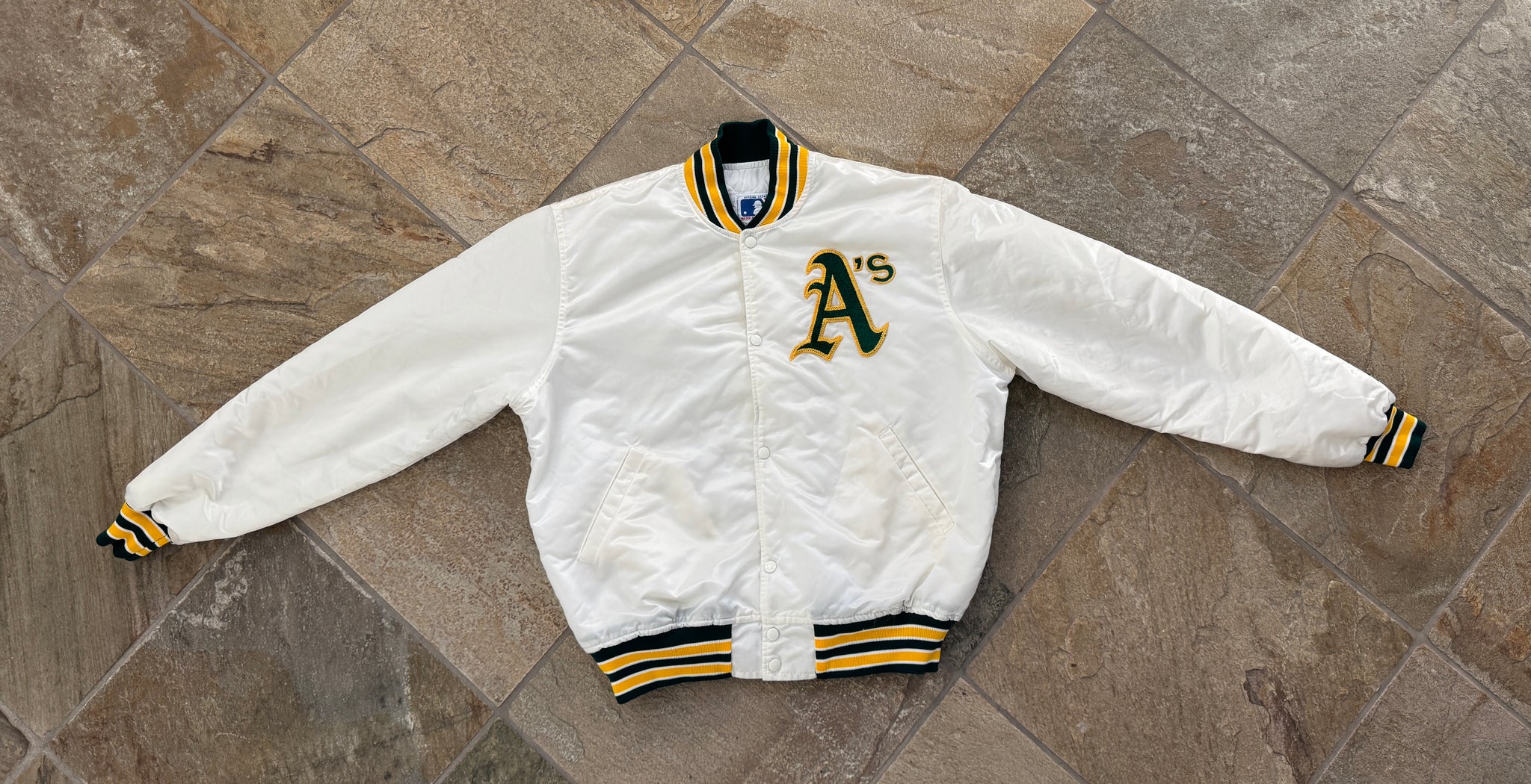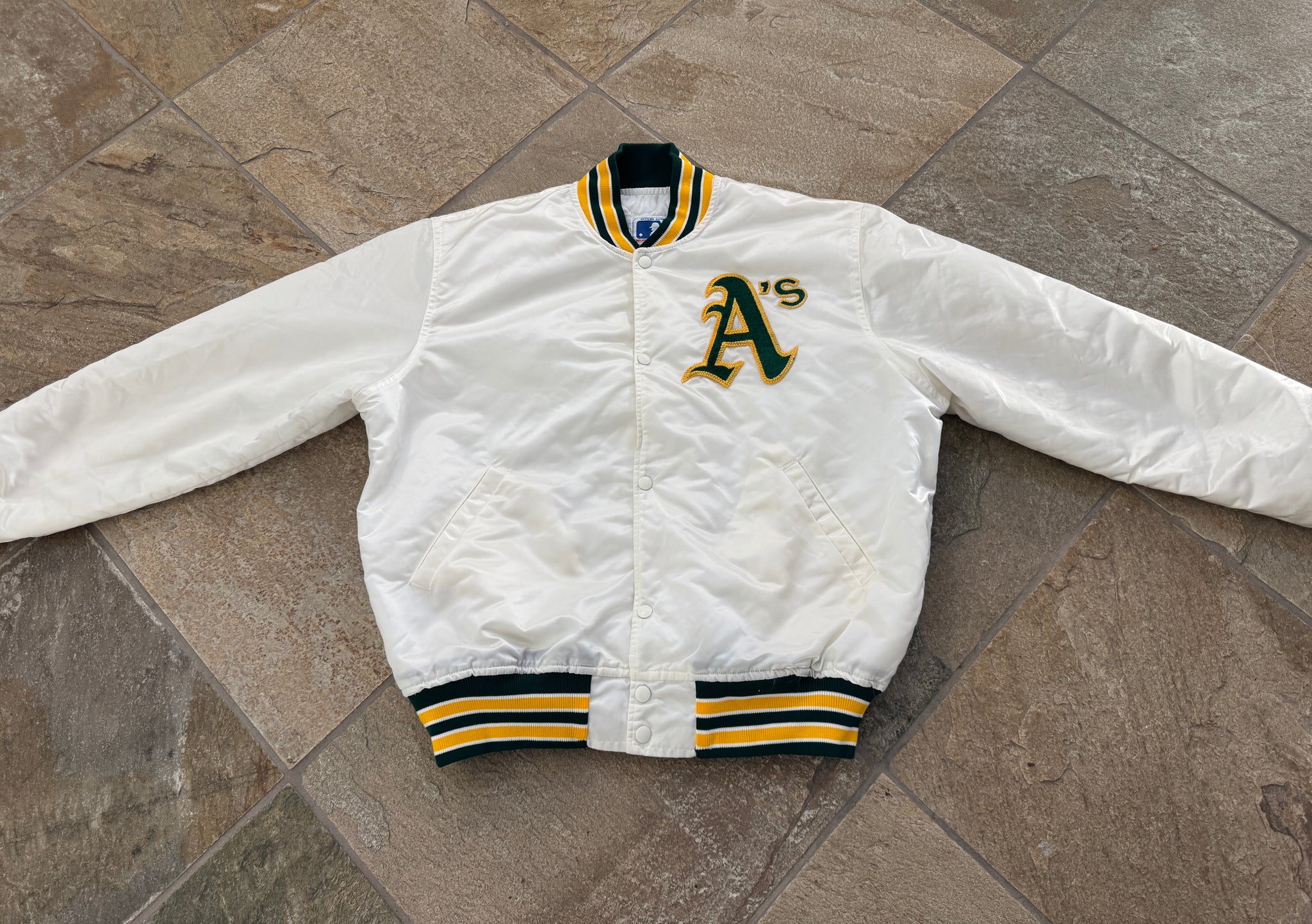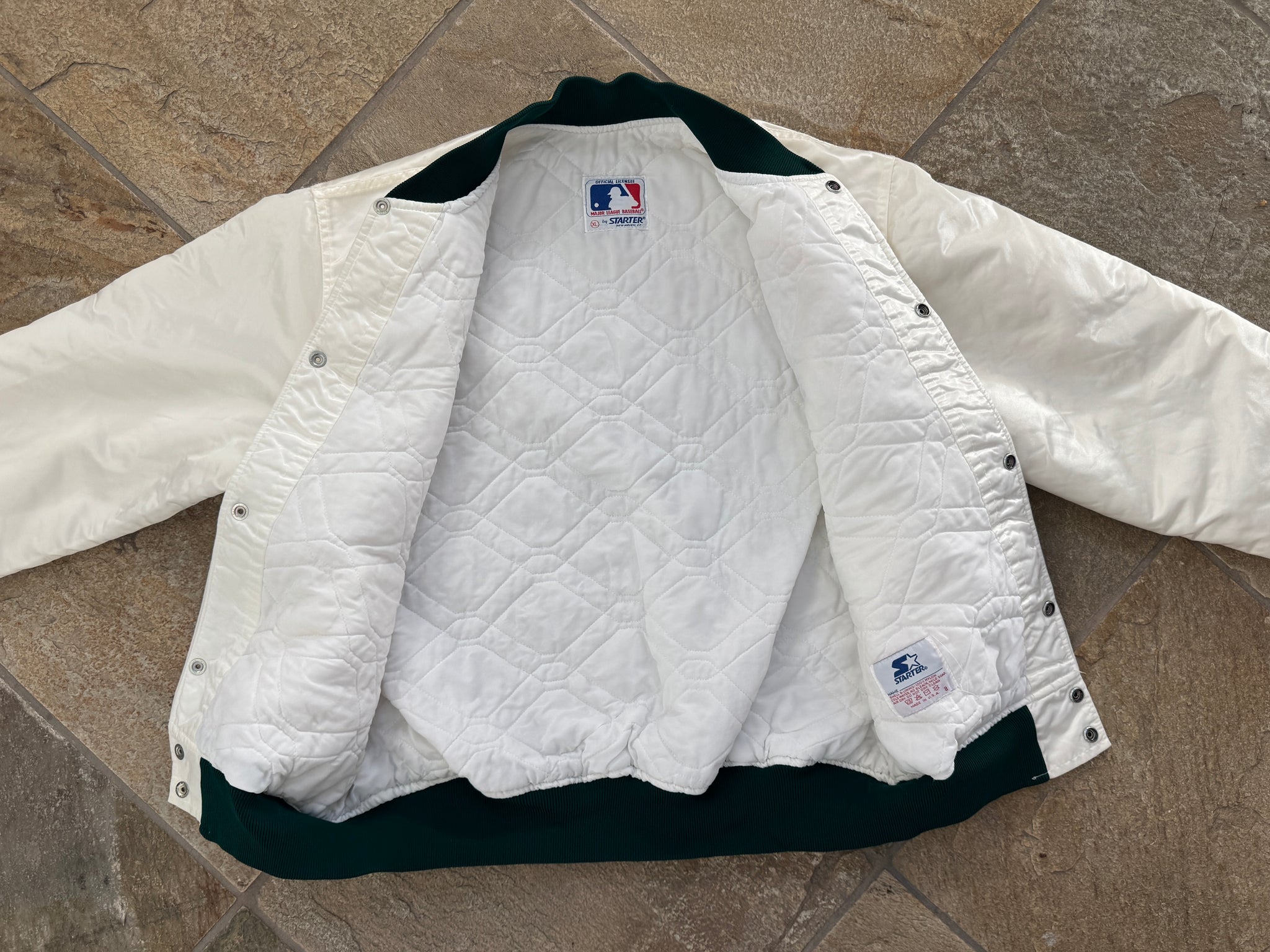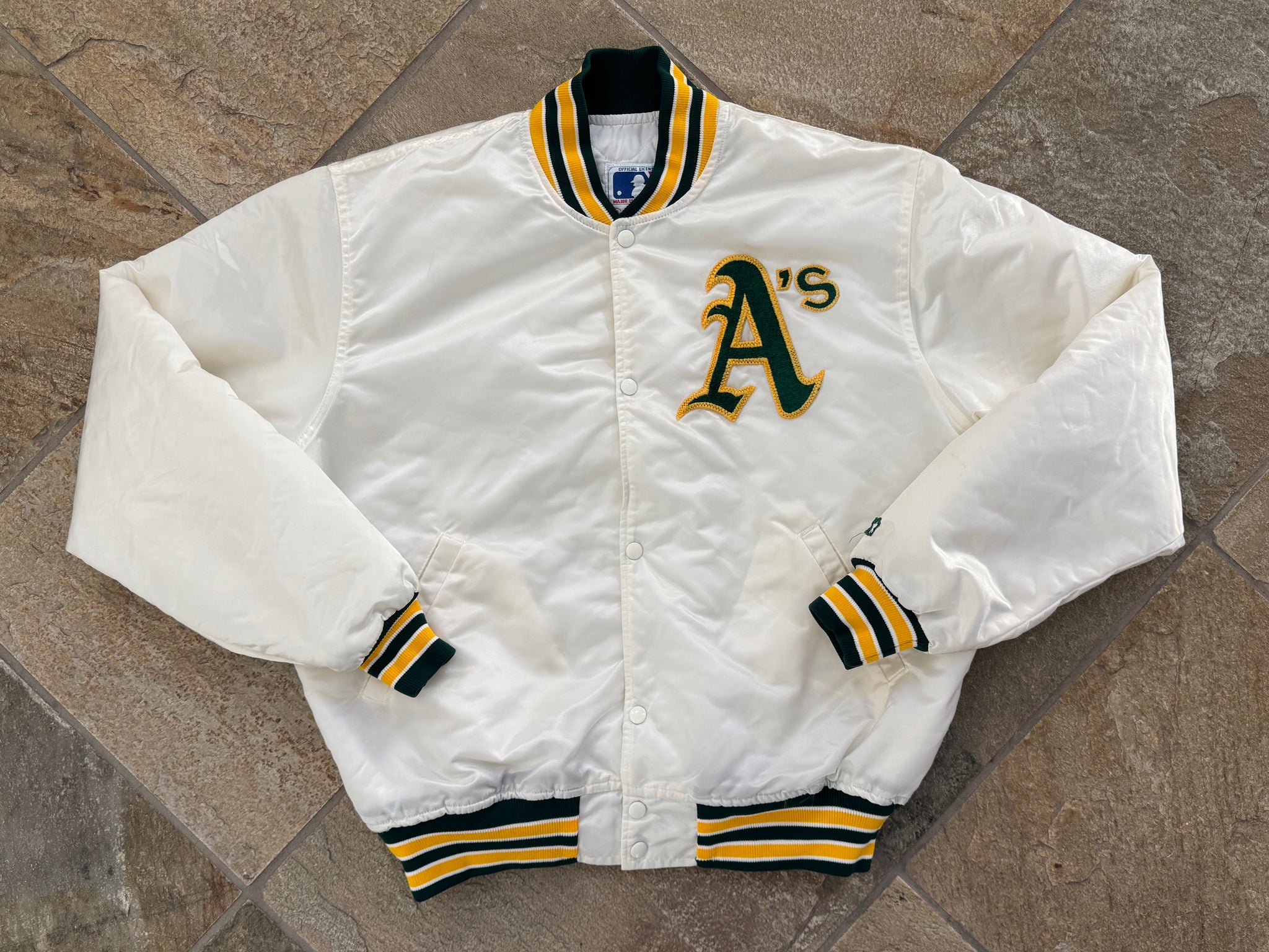 Vintage late 80s, early 90s Oakland Athletics A’s Starter Satin Baseball Jacket, Size extra large. Rare white. Great condition. See photos for measurements for measurements