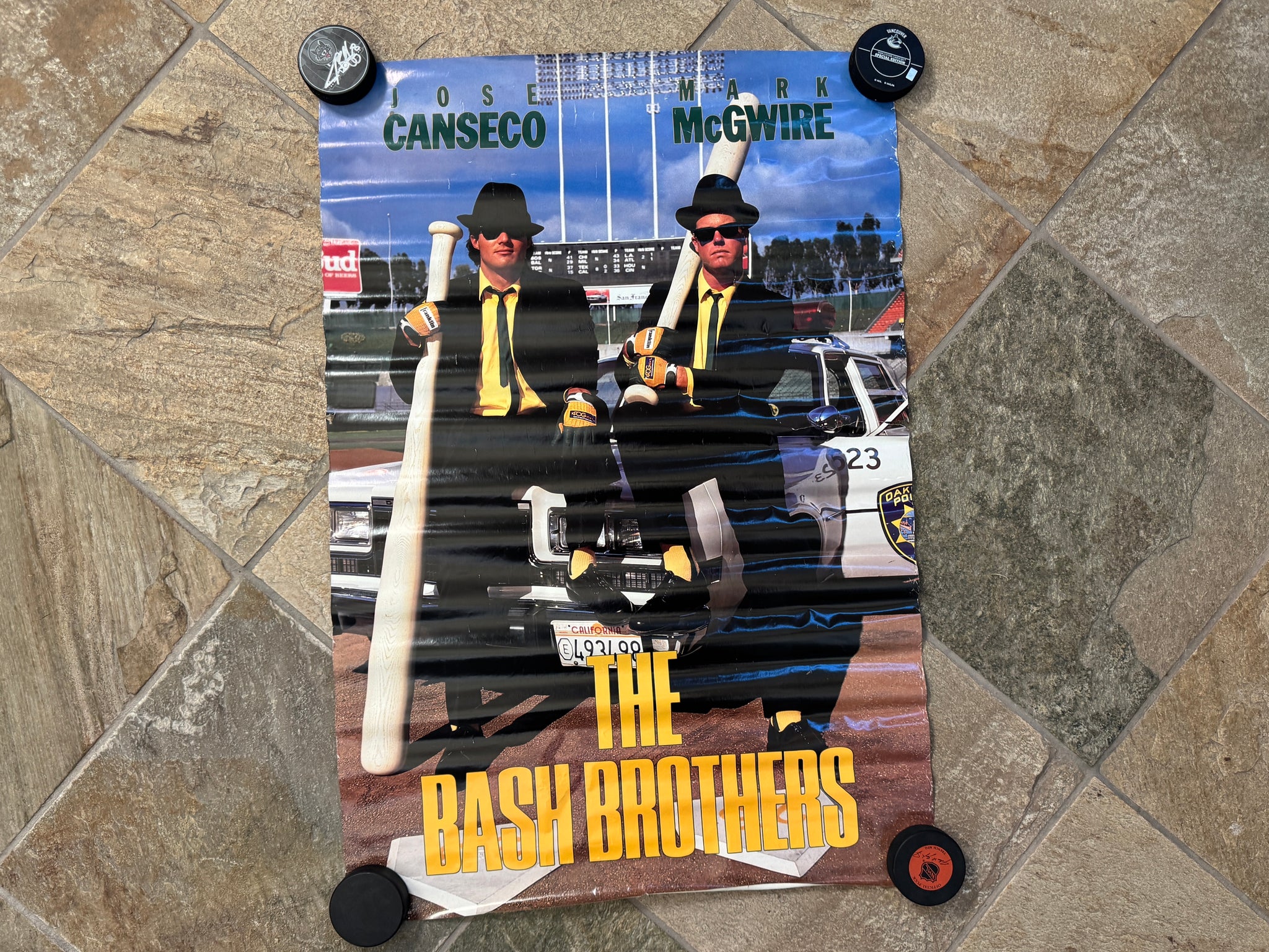 Vintage 80s 1988 Oakland Athletics A’s Bash Brothers Costacos Baseball Poster. Jose Canseco Mark McGwire. Roles and displayed condition. Small tip that has been taped on one side. Full size. See photos for measurements