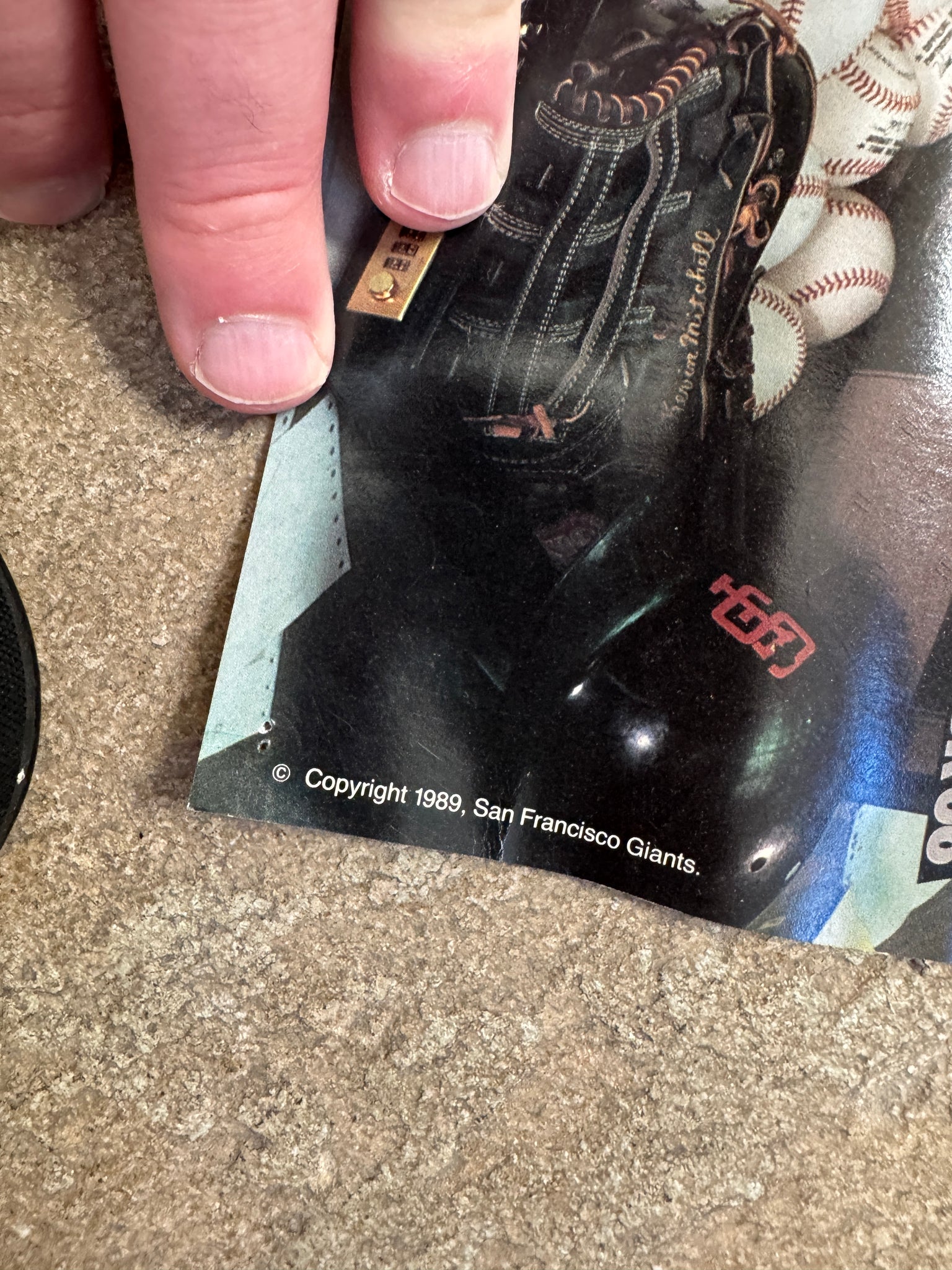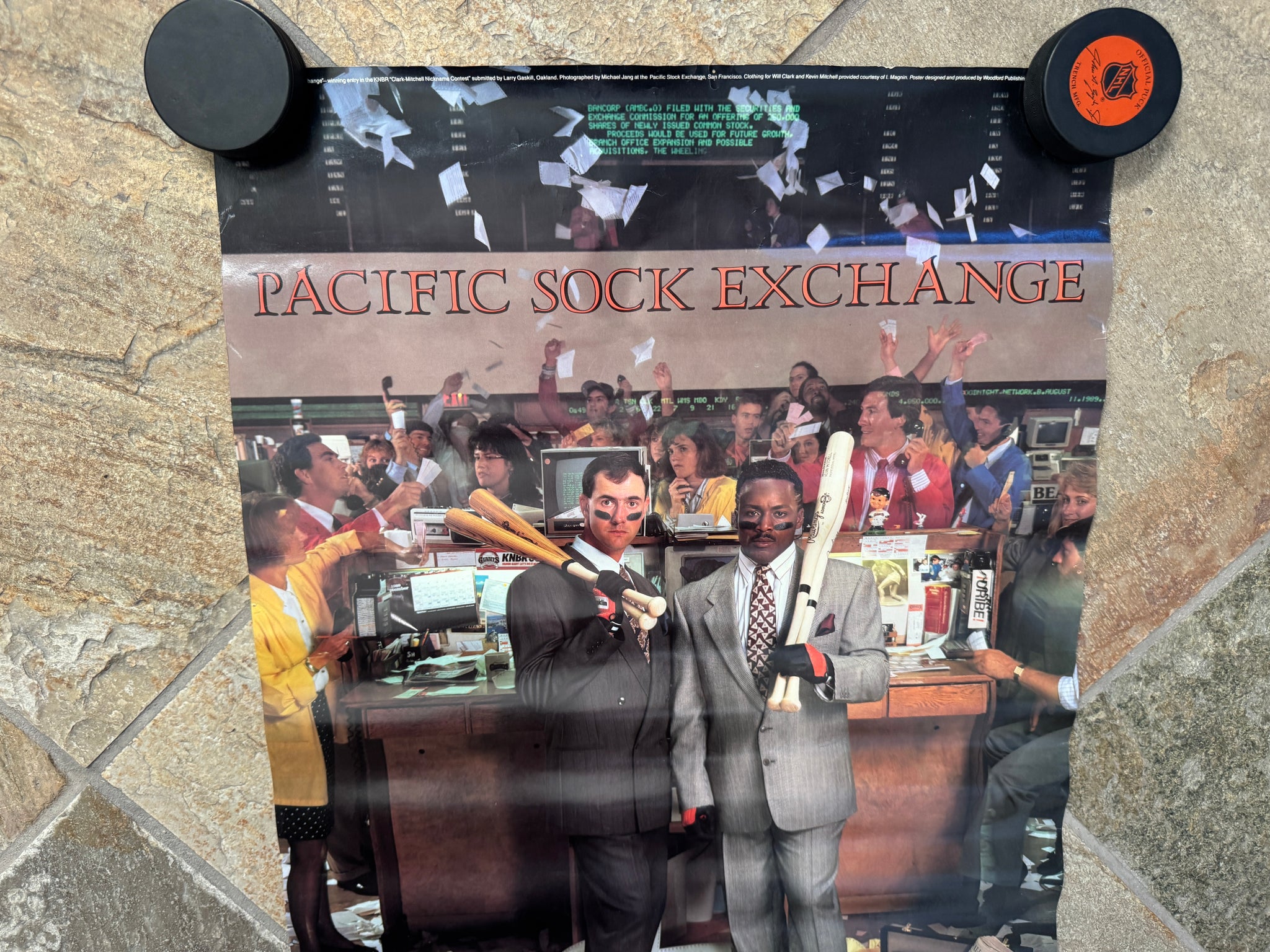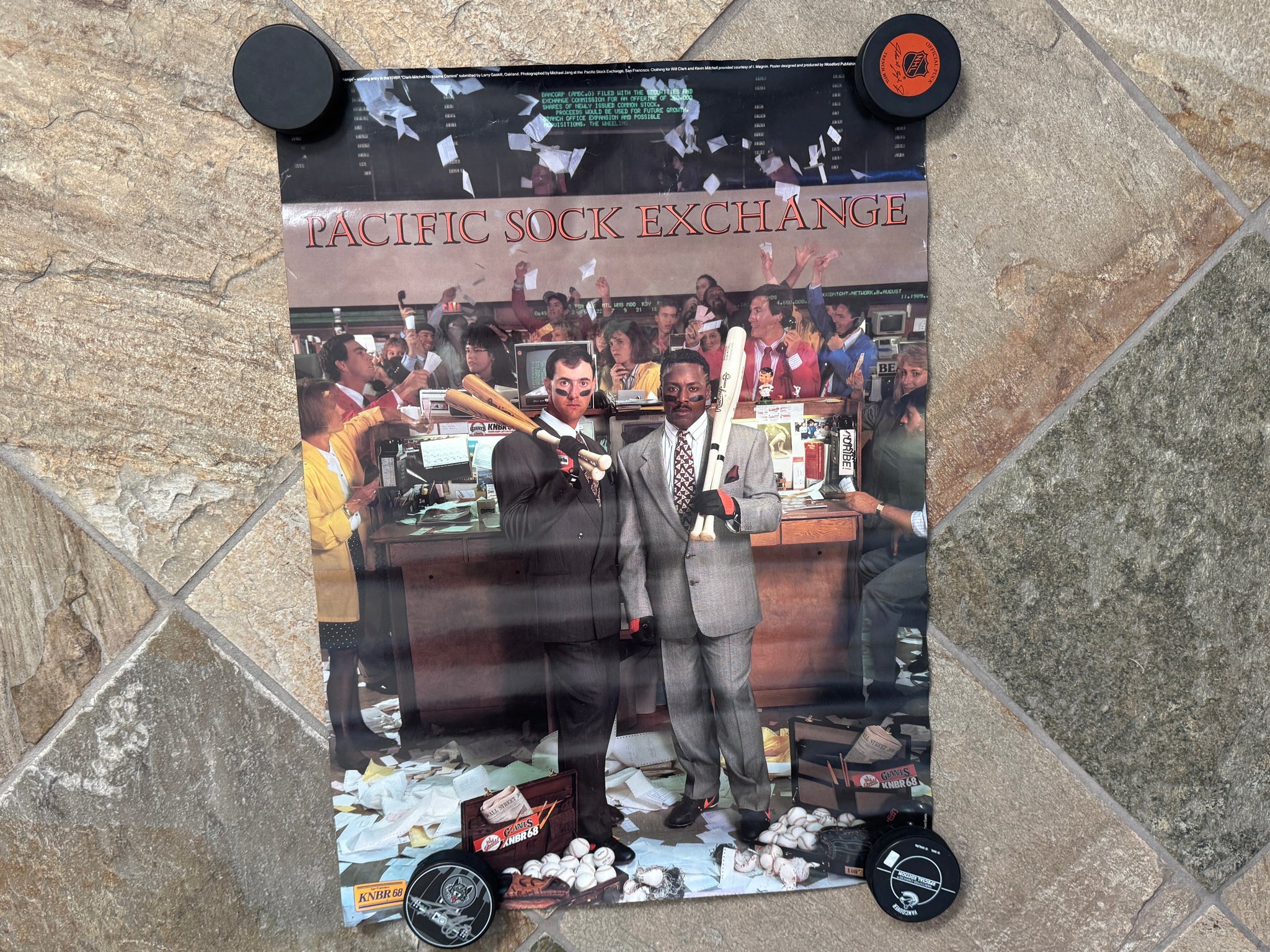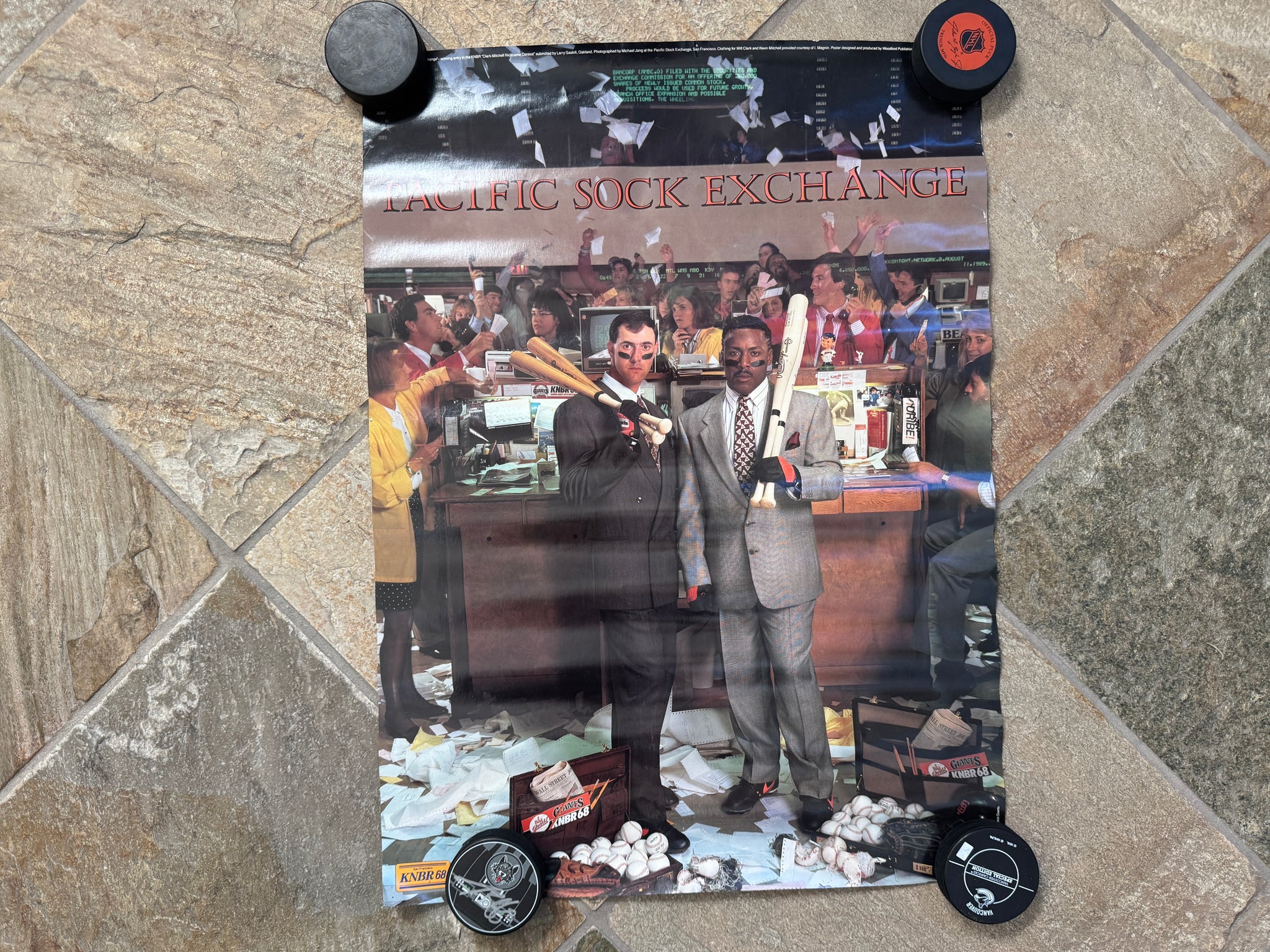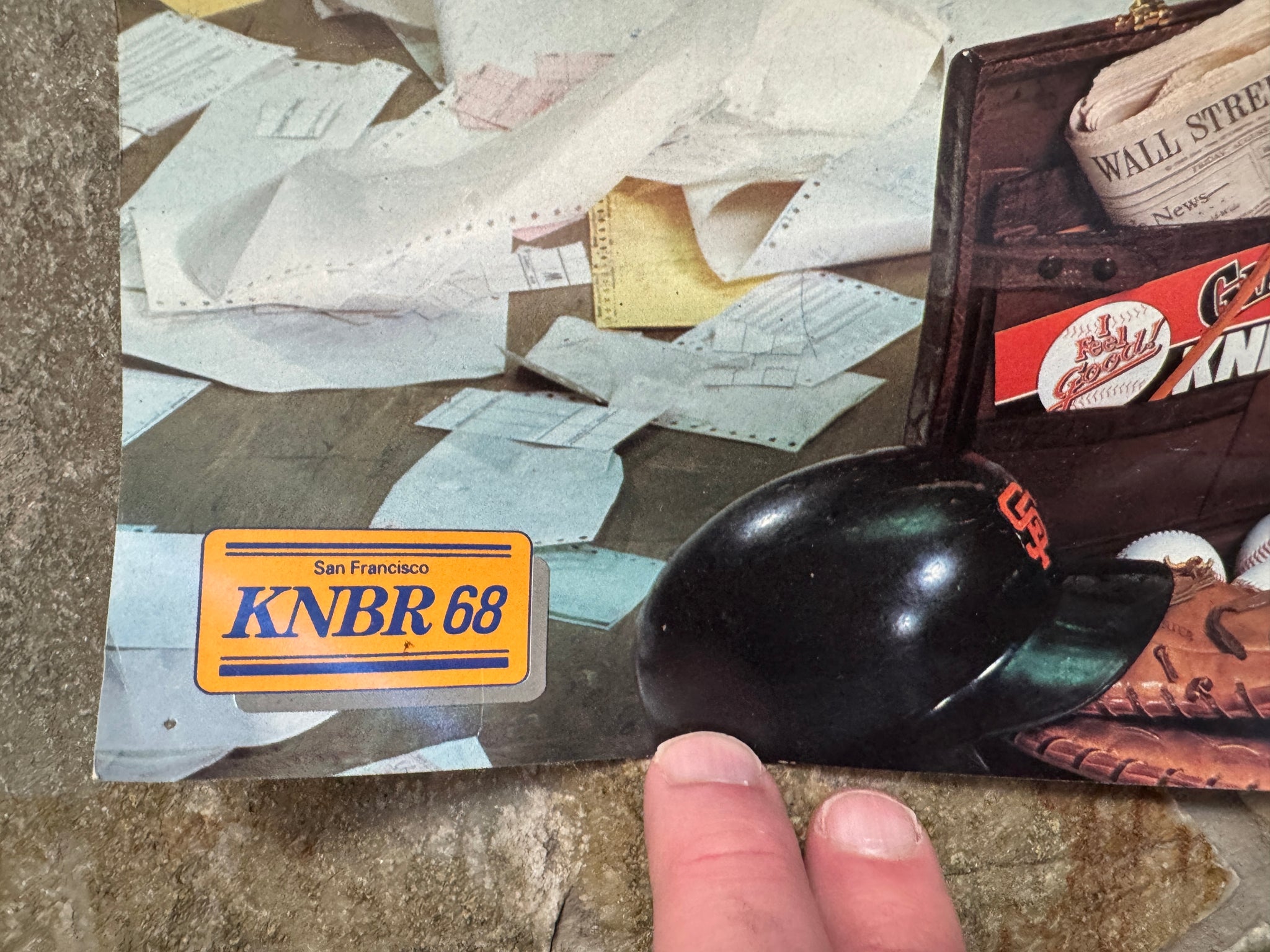 Vintage 80s San Francisco SF Giants Pacific Sock Exchange KNBR Baseball Poster. Kevin Mitchell and Will Clark- like Costacos Brothers style. Rolled and splayed condition. See photos for measurements