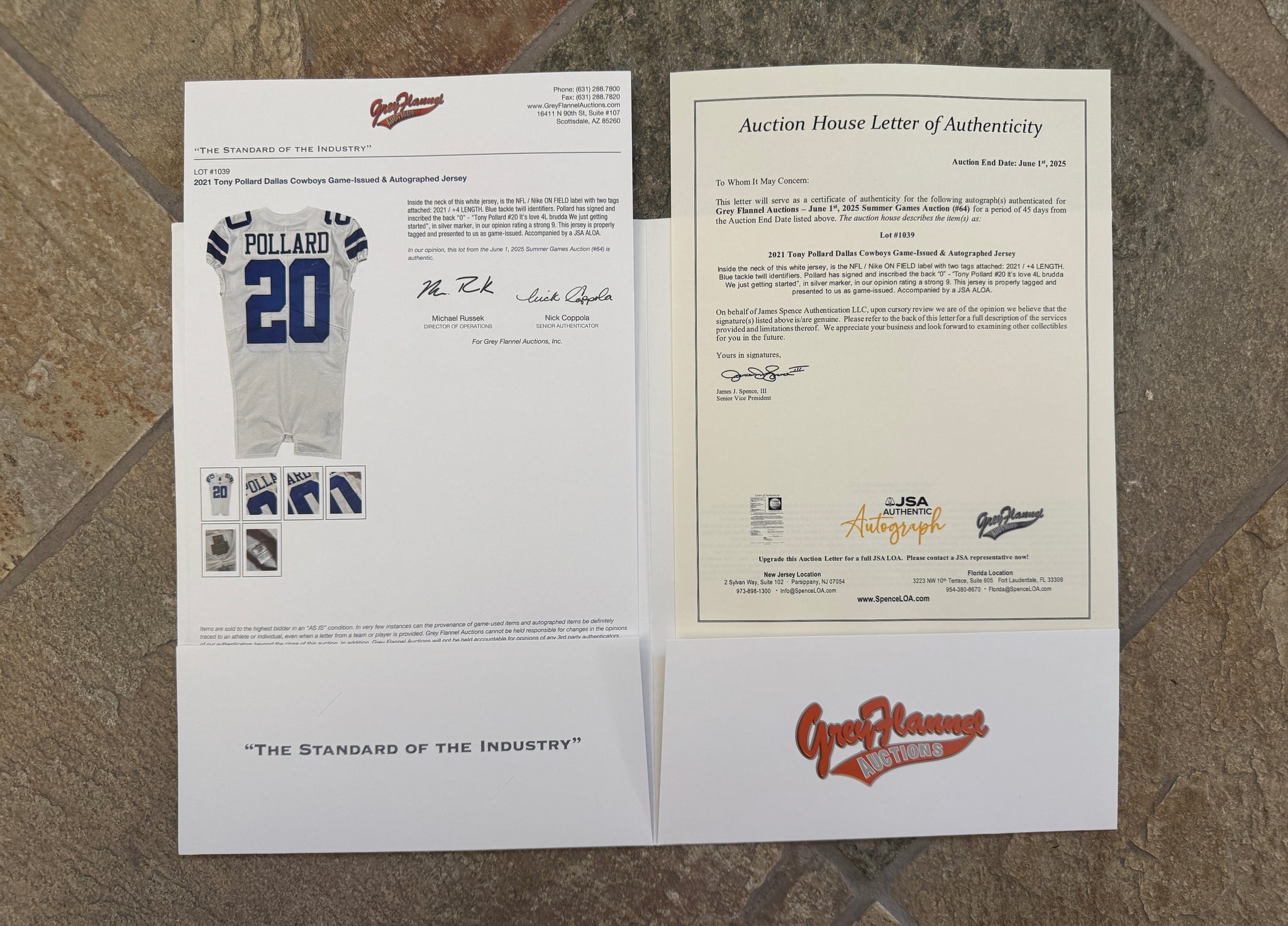 Dallas Cowboys Tony Pollard Game Issued Nike Football Jersey. Size 40. 2021. Listed and bought as team / game issued. Jersey shows signs of wear in places indicating it is likely game used and worn as well. Signed autographed. Comes with Grey Flannel Auction and JSA COA and LOA. See photos for measurements