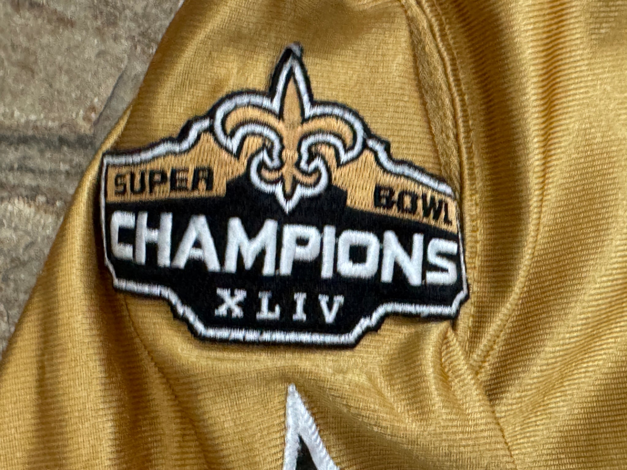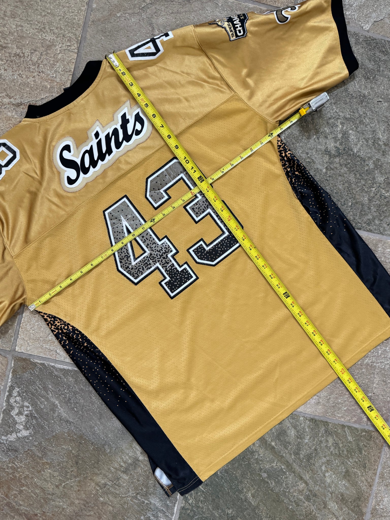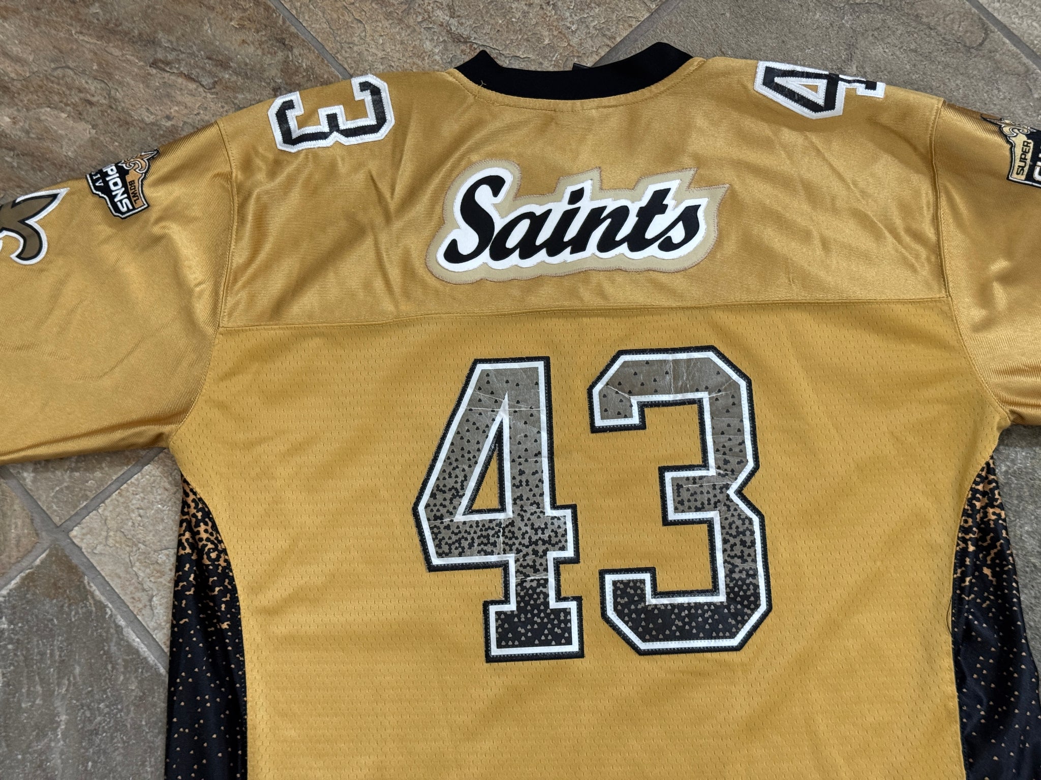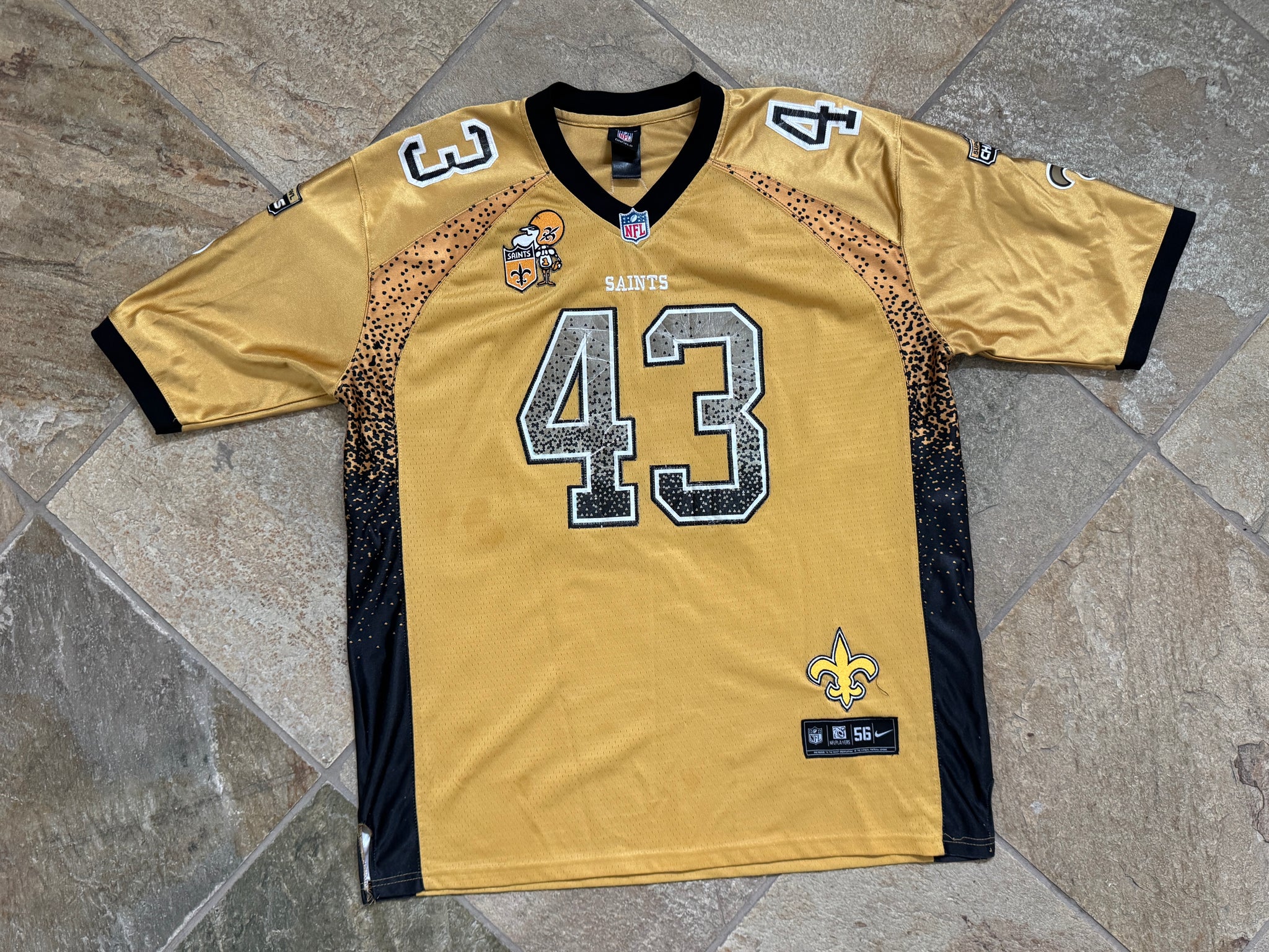 New Orleans Saints Reebok Football Jersey, Size 56, double extra large. Customized numbers, nameplate and patches. Good, used condition overall. See photos for measurements