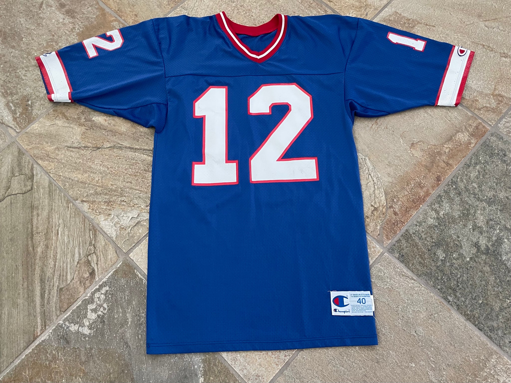 Vintage 90s Buffalo Bills Jim Kelly #12 Champion Football Jersey, Size 40, Medium. No nameplate. Minor wear on numbers. Very good condition overall. See photos for measurements