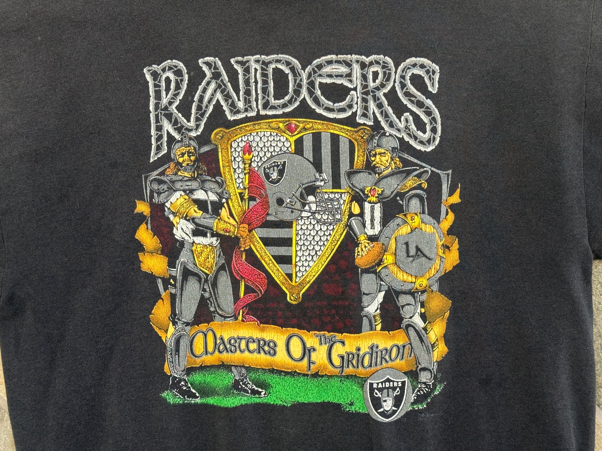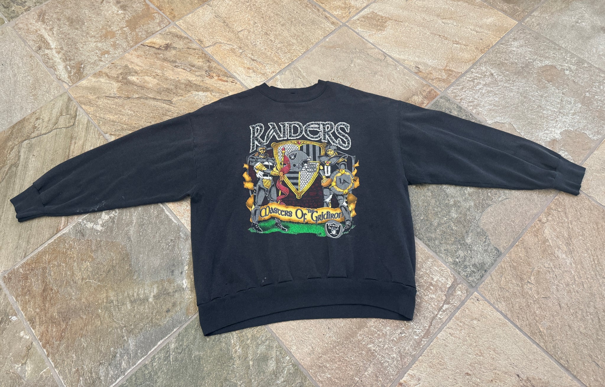 Vintage 90s Oakland Los Angeles LA Raiders Masters of the Gridiron Football Sweatshirt, Size large to extra large. Big logo graphic. Size tag removed. Minor wear spot on one sleeve. General wear and fade from wash. Good used condition overall. See photos for measurements